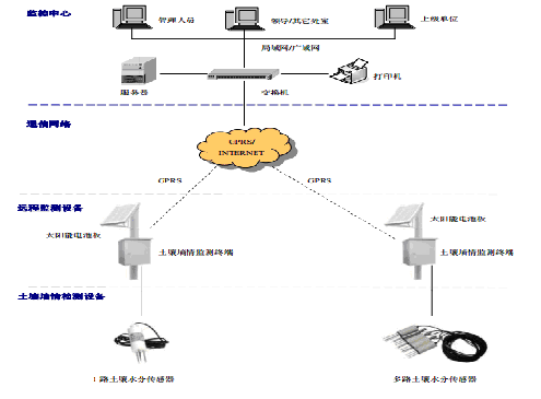 該系統(tǒng)主要由監(jiān)控中心、通信網(wǎng)絡(luò)、遠(yuǎn)程監(jiān)測(cè)設(shè)備和土壤墑情檢測(cè)設(shè)備四部分構(gòu)成。